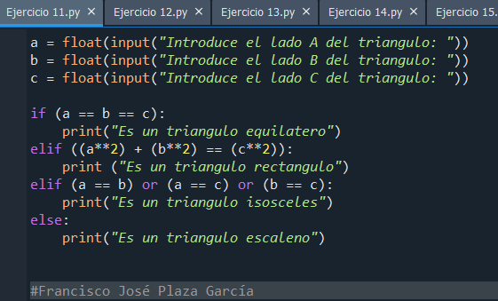 Este programa pide las longitudes de los tres lados de un triángulo y usa condicionales para comprobar si cumple el teorema de Pitágoras y si tiene lados iguales, determinando así el tipo de triángulo.