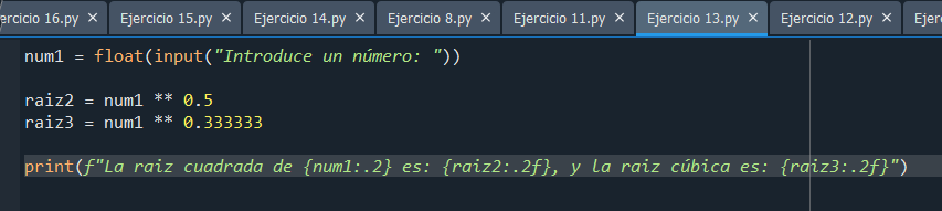 Este programa pide un número al usuario y calcula su raíz cuadrada y su raíz cúbica utilizando exponentes fraccionarios (**0.5 y **0.333333). Finalmente muestra ambas raíces con dos decimales.