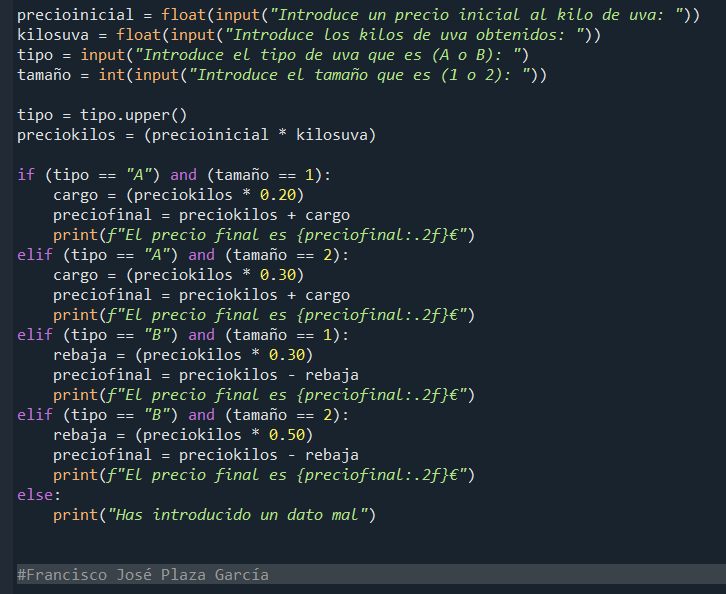 El algoritmo pide el precio inicial del kilo de uva, el tipo y el tamaño. Según estos datos, suma o resta una cantidad al precio base y calcula la ganancia total multiplicando por los kilos entregados.