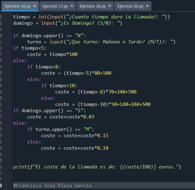 La política de cobro de una compañía telefónica es: cuando se realiza una llamada, el cobro es por el tiempo que ésta dura, de tal forma que los primeros cinco minutos cuestan 1 euro, los siguientes tres, 80 céntimos, los siguientes dos minutos, 70 céntimos, y a partir del décimo minuto, 50 céntimos. Además, se carga un impuesto de 3 % cuando es domingo, y si es otro día, en turno de mañana, 15 %, y en turno de tarde, 10 %. Realice un algoritmo para determinar cuánto debe pagar por cada concepto una persona que realiza una llamada.