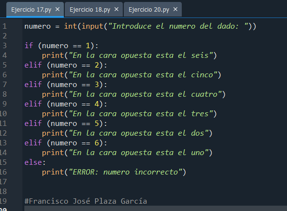Este programa pide un número del 1 al 6 y, mediante condicionales, calcula el valor de la cara opuesta del dado. Si el número no es válido, muestra un mensaje de error.
