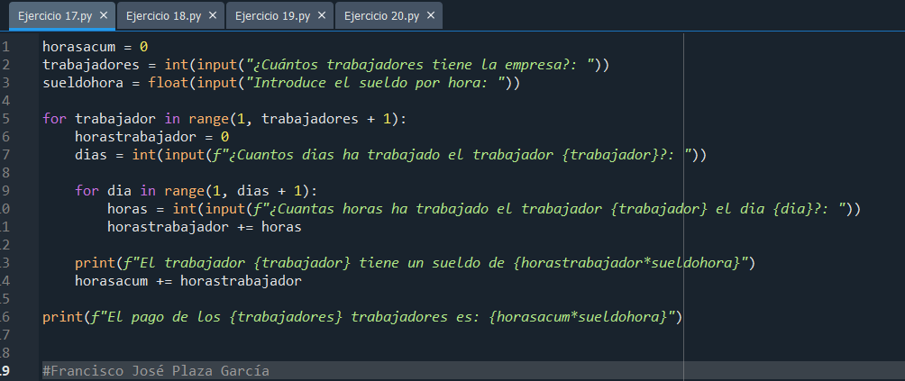 Este programa calcula el sueldo semanal de varios trabajadores. Para cada trabajador se registran los días trabajados y las horas de cada día. Mediante bucles, el programa suma las horas trabajadas, calcula el sueldo semanal de cada empleado y finalmente muestra cuánto pagó la empresa por todos los trabajadores.