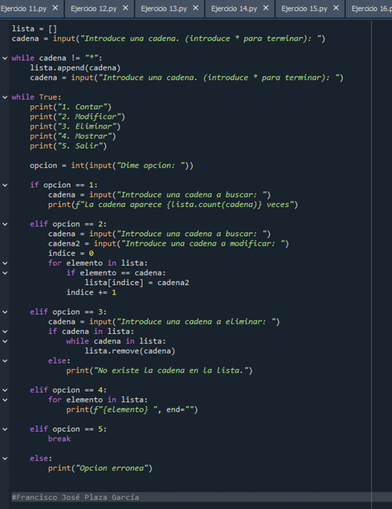 Hay que crear una lista de palabras con opciones para contar, modificar, eliminar y mostrar. Lo he hecho usando un menú con while, utilizando count() para contar apariciones, recorriendo la lista para modificar palabras y remove() para eliminarlas.