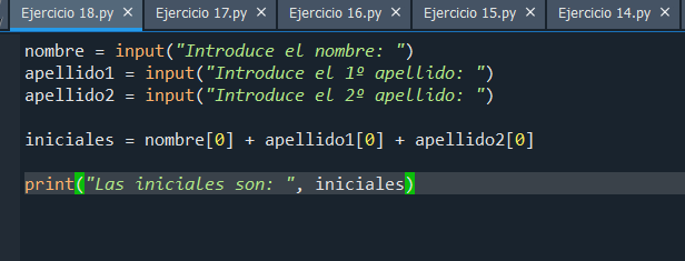 Este programa solicita el nombre y los dos apellidos del usuario. Luego toma la primera letra de cada uno y las concatena para formar las iniciales, que se muestran en pantalla.