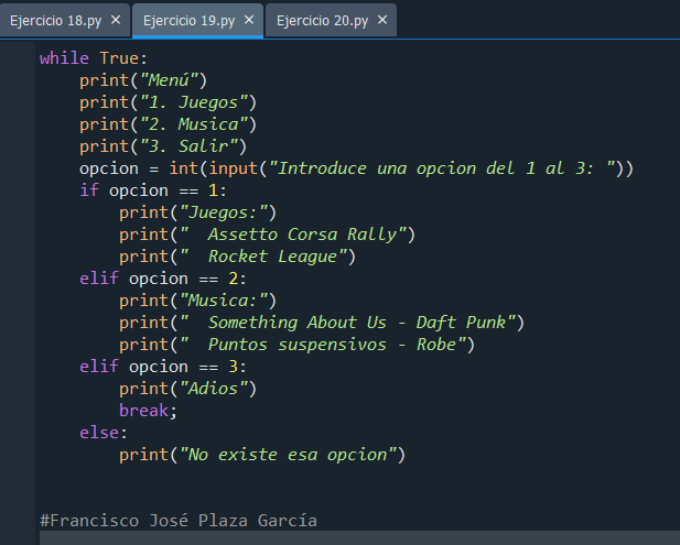Este programa muestra un menú con distintas opciones que el usuario puede elegir. Mediante un bucle, el menú se repite constantemente hasta que el usuario selecciona la opción de “Salir”. Dependiendo de la opción elegida, el programa ejecuta una acción diferente o finaliza cuando se indica salir.