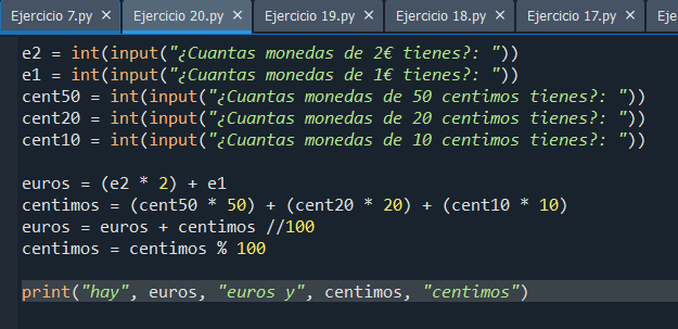 El programa solicita la cantidad de monedas de 2€, 1€, 50, 20 y 10 céntimos. Calcula el valor total en euros y céntimos, teniendo en cuenta las conversiones entre ellos, y muestra el total desglosado en euros y céntimos.