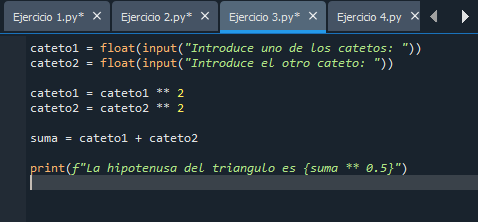 Este programa nos pide lo mismo que el anterior pero con diferentes operaciones, esta vez hay que elevar ambos catetos al cuadrado, sumarlos y aplicar la raiz cuadrada (con **0.5) y imprimirlo en pantalla.