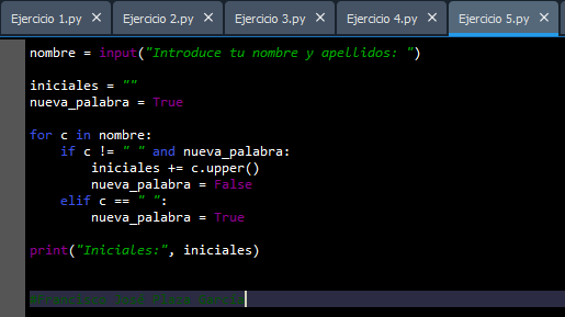 En este ejercicio trabajé con una cadena que contiene un nombre y apellidos. Primero separé la cadena en palabras utilizando los espacios y luego tomé la primera letra de cada palabra. Finalmente convertí esas letras a mayúsculas para mostrar las iniciales.