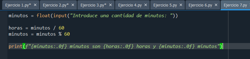 Este programa pide una cantidad de minutos y calcula cuántas horas completas contiene dividiendo entre 60. Después obtiene los minutos sobrantes con el operador módulo % Finalmente muestra el resultado en formato horas y minutos.