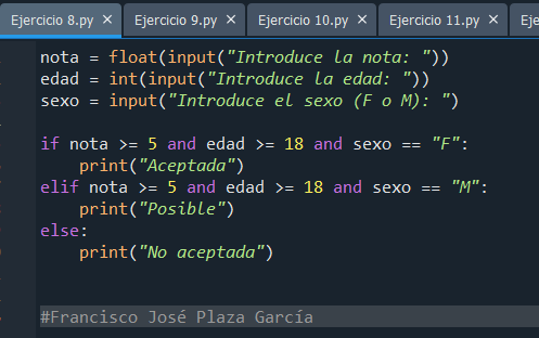 Algoritmo que pida dos números ‘nota’ y ‘edad’ y un carácter ‘sexo’ y muestre el mensaje ‘ACEPTADA’ si la nota es mayor o igual a cinco, la edad es mayor o igual a dieciocho y el sexo es ‘F’. En caso de que se cumpla lo mismo, pero el sexo sea ‘M’, debe imprimir ‘POSIBLE’. Si no se cumplen dichas condiciones se debe mostrar ‘NO ACEPTADA’.