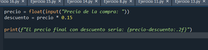 El programa solicita el precio original de una compra, calcula el 15% de descuento y muestra el precio final con el descuento aplicado, redondeado a dos decimales.